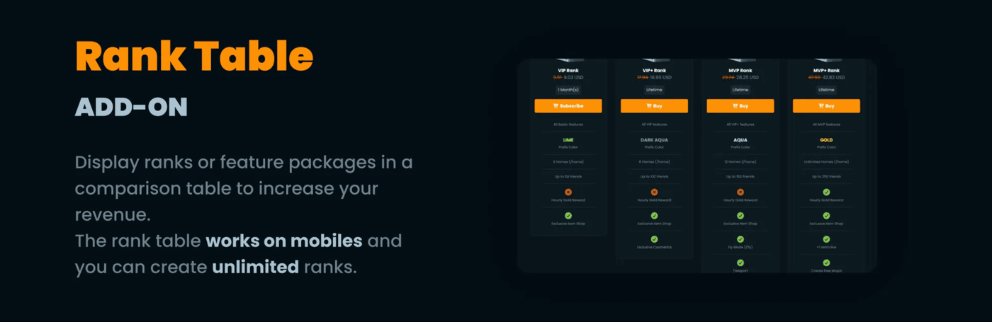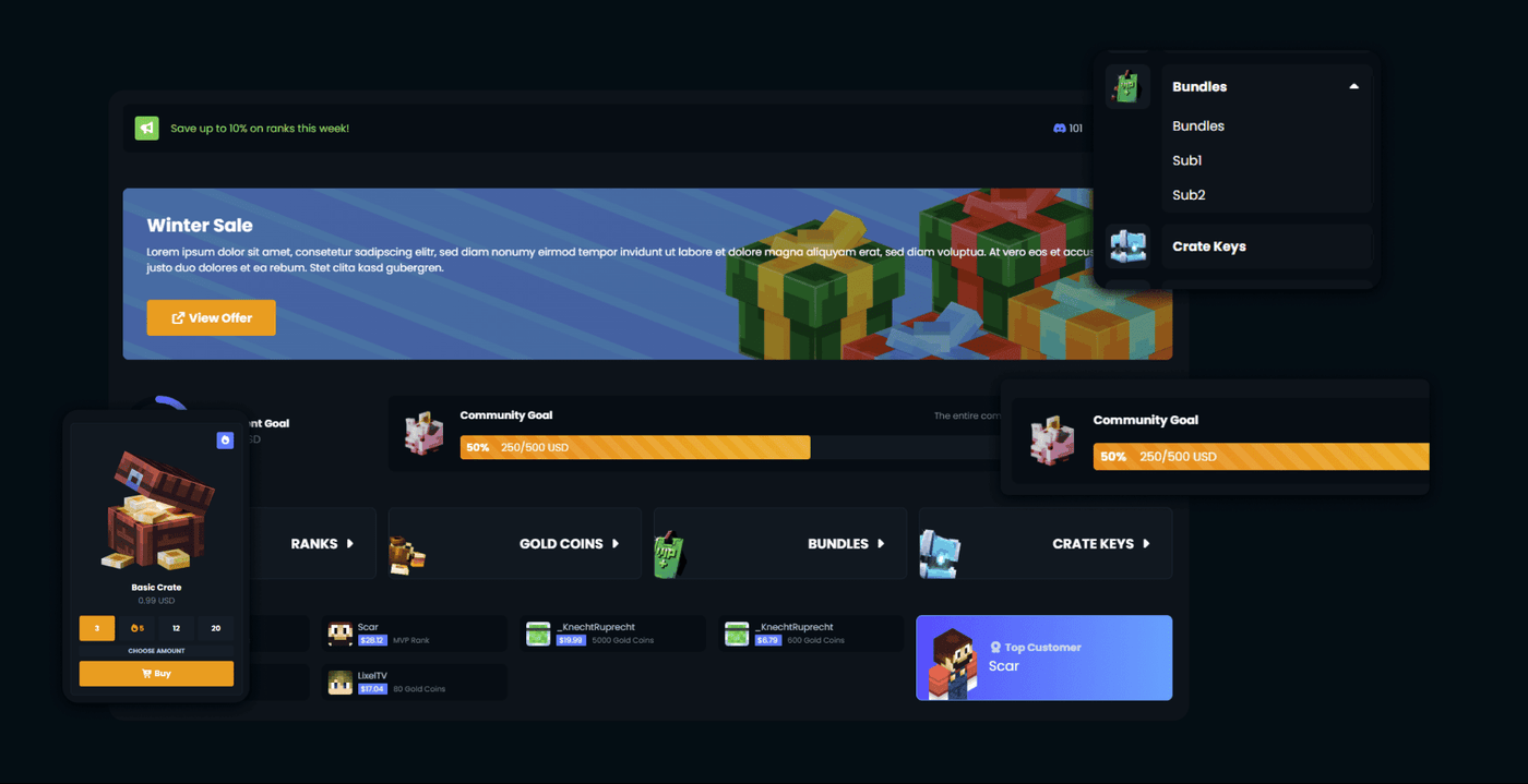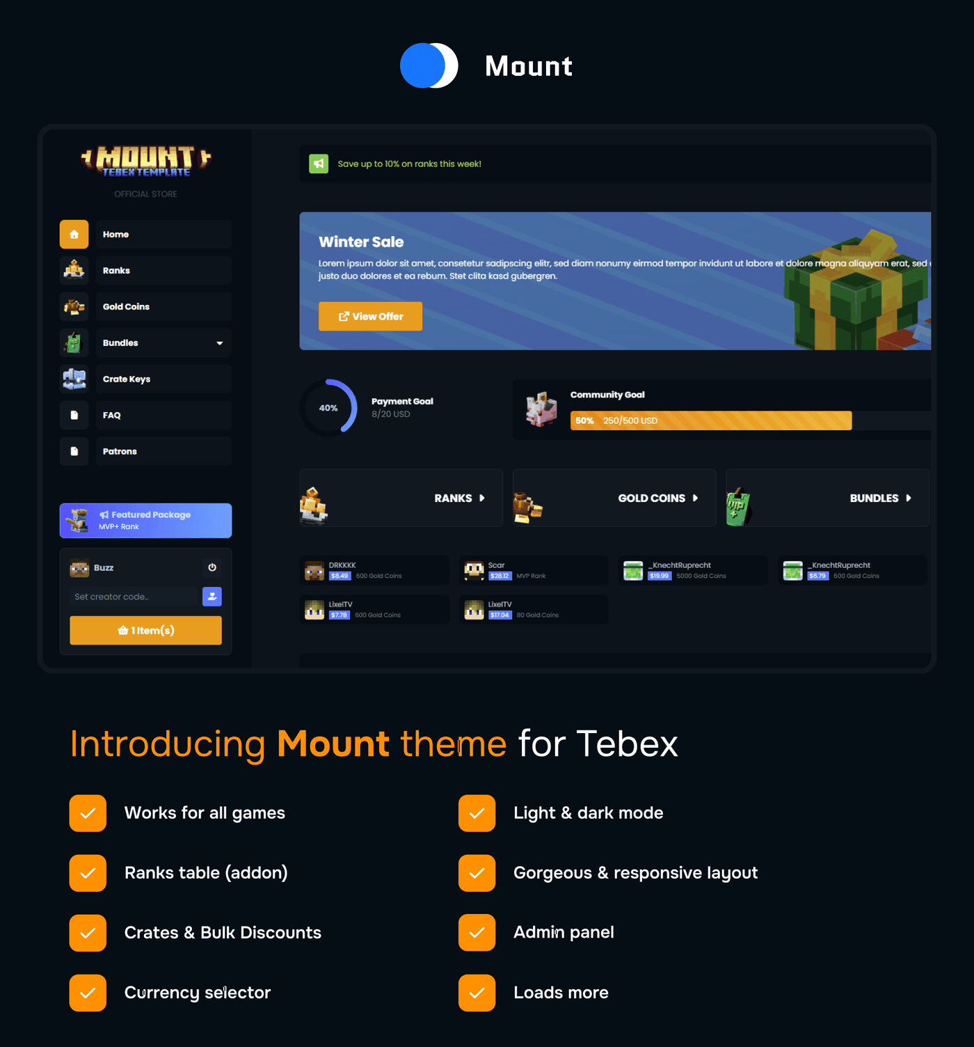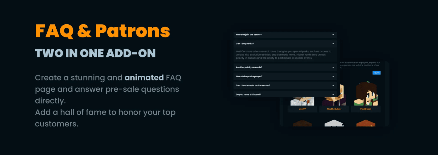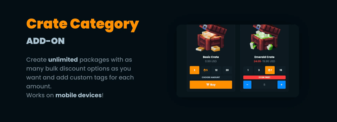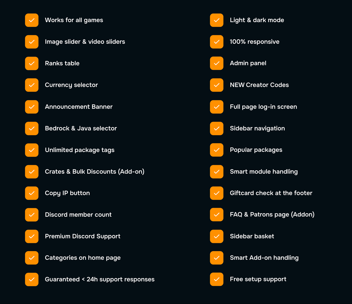 ALL GAMES, 100% Responsive, Crates, Rank Table, Bedrock Java, FAQ Page, Patrons, Modern Design