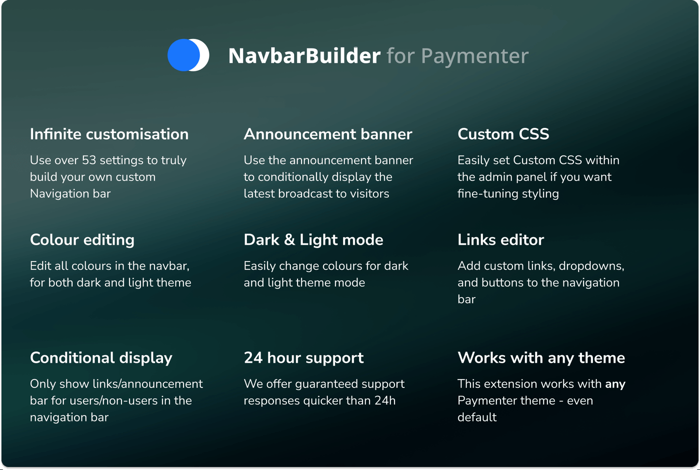 Works with any theme for paymenter, has lots of options to customize the navbar and make it perfect for whatever is needed